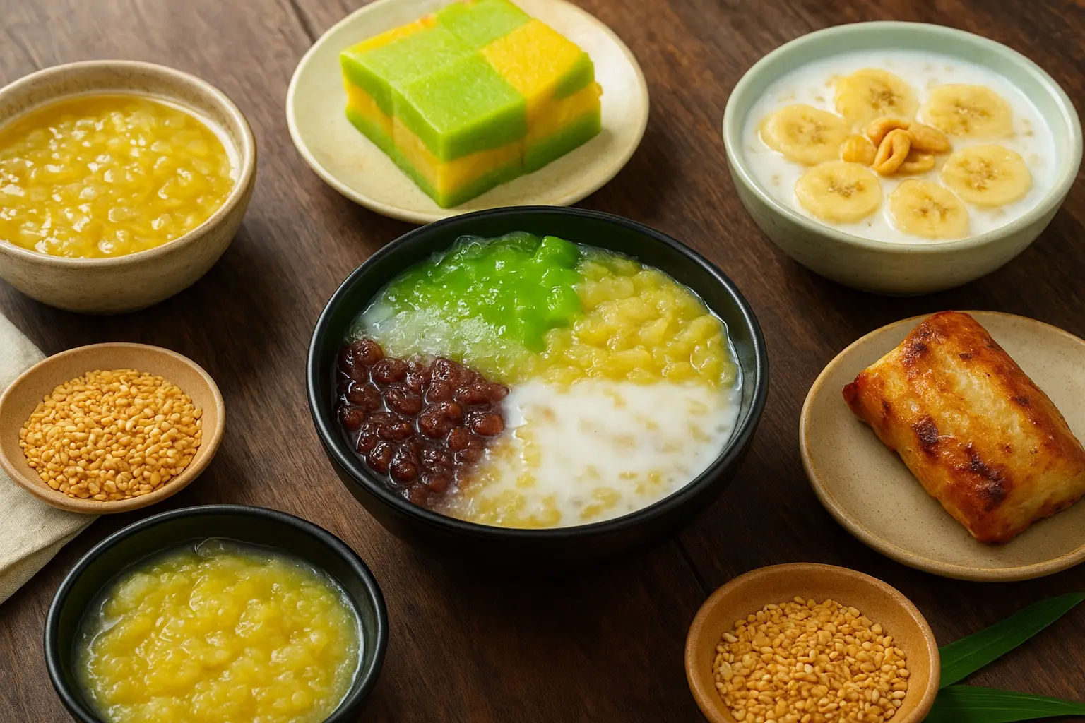 Most desserts feature core ingredients such as coconut milk, pandan leaves, glutinous rice, mung beans, tapioca pearls, and tropical fruits like bananas, mangoes, and durian. Together, these ingredients create everything from refreshing iced desserts for hot days to warm, comforting treats perfect for cooler weather.